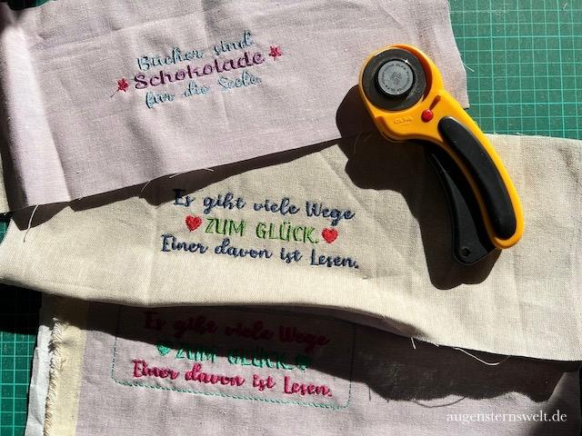 Letztes Jahr hatte ich schon ein paar passende gestickte Sprüche ausgesucht und mit meiner Pfaff Creativ 3.0 auf Essex Yarn Dyed Linen und Leinen gestickt. Der Plan war, daraus Büchertaschen zum Verschenken zu nähen.