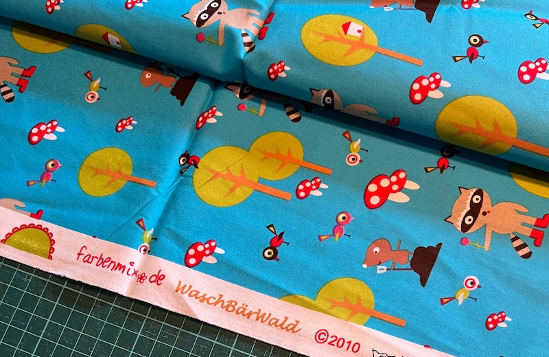Und, hier zeige ich euch den Stoff, der am Freitag zu den kreativen Köpfen auf die Reise geht. Es ist die Farbenmix Baumwolle-Webware von Paulapü: „WaschBärWald“ (2010). Ein paarmal hatte ich schon Geburtserinnerungskissen daraus genäht. Irgendwie kommt der Stoff nicht aus der Mode, aber ich gebe ihn gerne ab, für die kreative UFO-Stoffverwertung! Der ist doch echt süß, oder?