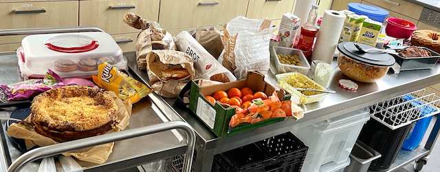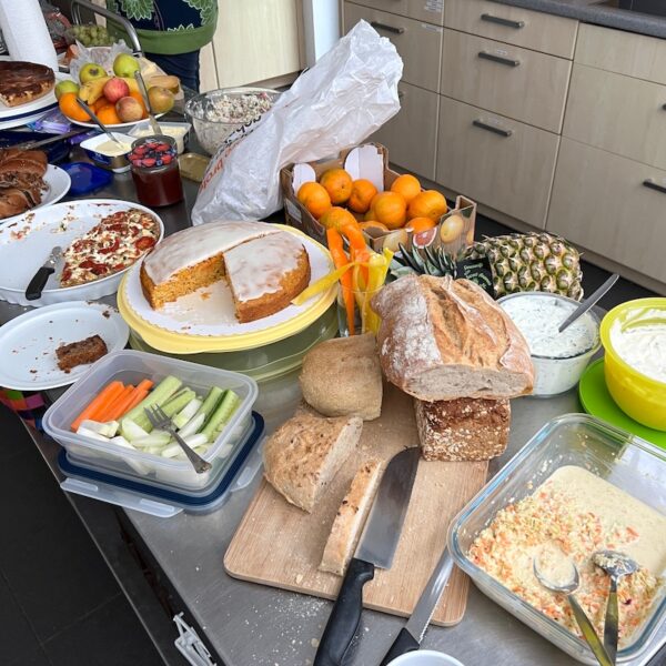Nach dem Aufbau ratterten auch schon die Nähmaschinen. Einige trafen sich zum Frühstück in der Küche am leckeren Büfett und hielten ein Pläuschchen. Später wollten alle das Rezept von Silke B. haben. Die Dattelcreme war aber auch zum Reinsetzen lecker! 😉