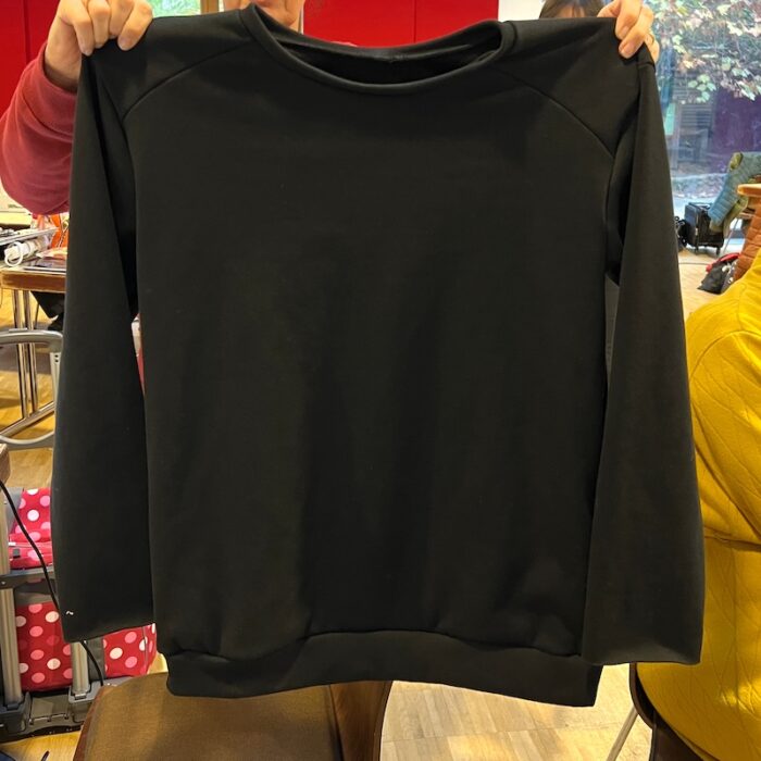 Simone brachte sich wieder schöne Stoffe mit und nähte sich zwei „Feel good“ – Hoodies und Musselin Schals, in tollen Frühlingsfarben. Silke S. nähte sich aus einem Zuleeg Wollstoff eine Jacke von Burda, Sandra zauberte sich ein Jerseykleid, und zwar Chloé von Pattydoo und Angelika K. nähte mit der Hand Spitzendeckchen auf ein Bettlaken. Und ich hatte mir von Kasia eine Trapunto Stickdatei gekauft und mir damit einen Hoodie Hudie bestickt und genäht.