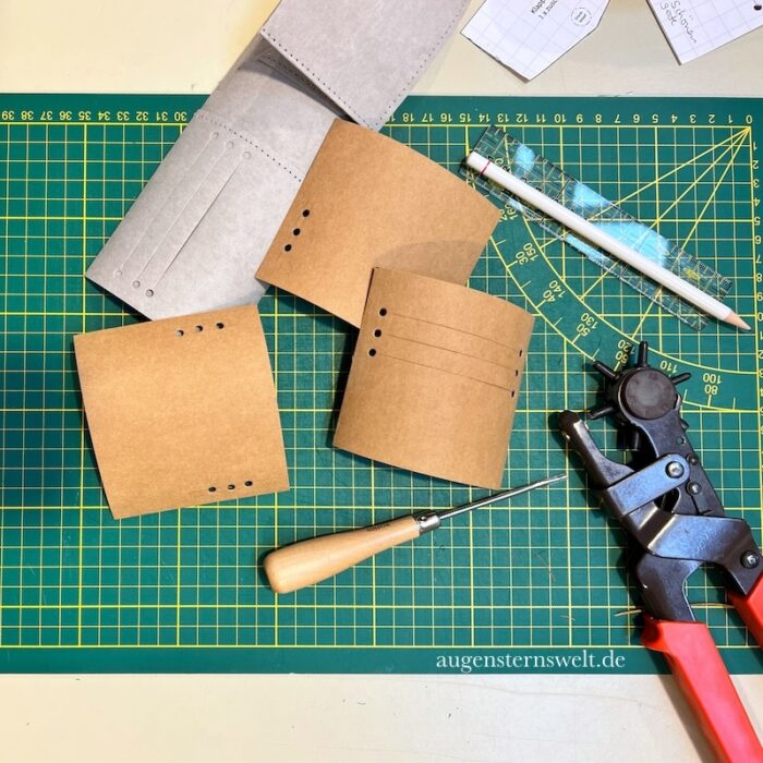 Als Tipps kann ich sagen, A: die Schnitte von der Oberseite schneiden, da es einfach besser aussieht. B: mit der Lochzange sehen „angezeichnete“ Löcher schöner aus. Werden die Löcher ausgestanzt, geht die Markierung mit flöten. Allerdings musste ich einige Male probieren, bevor die Karteninnenfächer richtig schön aussahen, aber wie man sieht hat es doch ganz gut geklappt. Also vorher unbedingt Trockenübungen machen und C: das Außenteil minimal vergrößern, so an jeder Kante nur 2-3 Millimeter. Dann sieht die Geldbörse am Ende viel, viel schöner aus. Da sonst das Innenleben seitlich zu stark nach außen gedrückt wird. Tja, manche Tipps kann man halt erst nach der 5. Geldbörse weitergeben. Und, der Rat aus dem Video die Löcher mit einem Vorstecher, also einer Ahle anzuzeichnen war wirklich zielführend! Mit guten Erfahrungswerten läuft es beim Basteln einfach besser. 😉