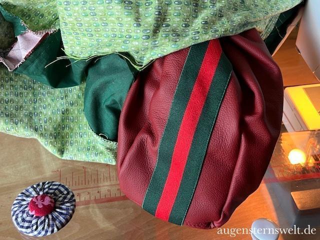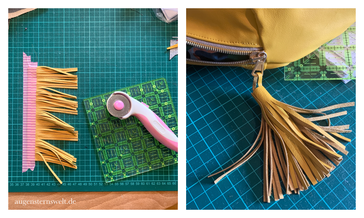 Außen nähte ich eine Reißverschlusstasche ein. Da man den Stoff nicht auf das Leder stecken kann, verwendete ich Tape zum Fixieren. Das hat ganz gut geklappt.