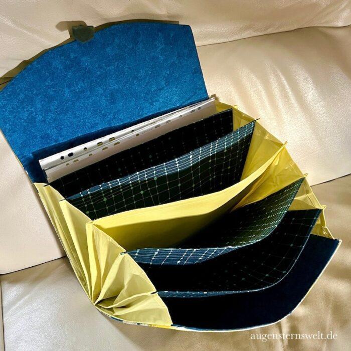 Noch kurz erwähnt, meine Projektmappe habe ich mit einem Lederriemen und Kugelnieten, die in das Leder geschraubt werden versehen. Innen befinden sich 6 Fächer plus ein kleines Fach unter der Klappe. Die Mappe ist sehr praktisch, da man nicht nur Schnittmuster darin aufbewahren kann, sondern auch z.B. seine Steuerunterlagen. Originalton von Martina. 🙂