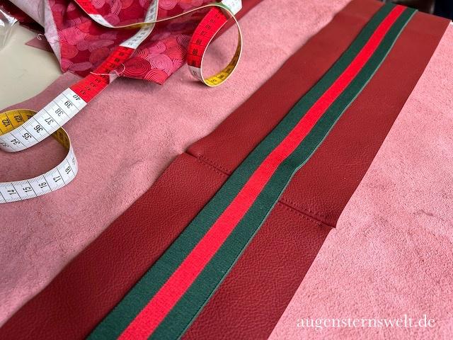 Das breite Band ist ein Gummiband und es ließ sich vorzüglich mit einem Gradstich auf den Taschenboden und die Seitenteile aufnähen. Allerdings beherzte ich den Tipp von Martina, es mit doppelseitigem Klebeband, also Style fix vorher zu fixieren. Da beim Aufnähen das Band sonst verrutschen würde.