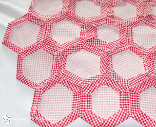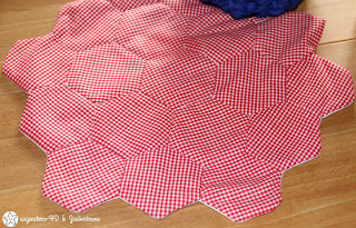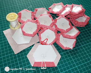 Wie ich im letzten Jahr durch ihren Bloggeburtsag erfuhr, liebt sie Hexagontäschchen. Also nähte ich eins für sie. Und zwar so: Als Oberstoff verwendete ich einen dünnen Jeansstoff aus der Restekiste, den ich mit Hexies der Größe 1 Inch, also 2,54 cm verzierte. Innen fütterte ich die Mimi Pouch mit einem low volume Patchworkstoff. Einen Einblick in die Tasche habe ich allerdings vergessen zu fotografieren. Hier also mein Täschchen….