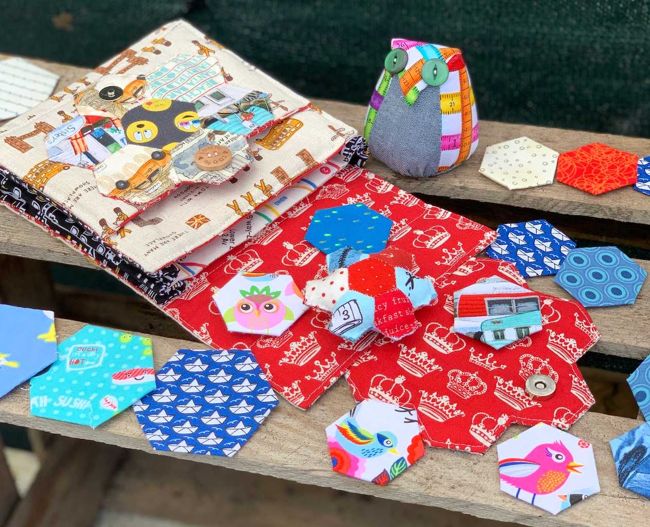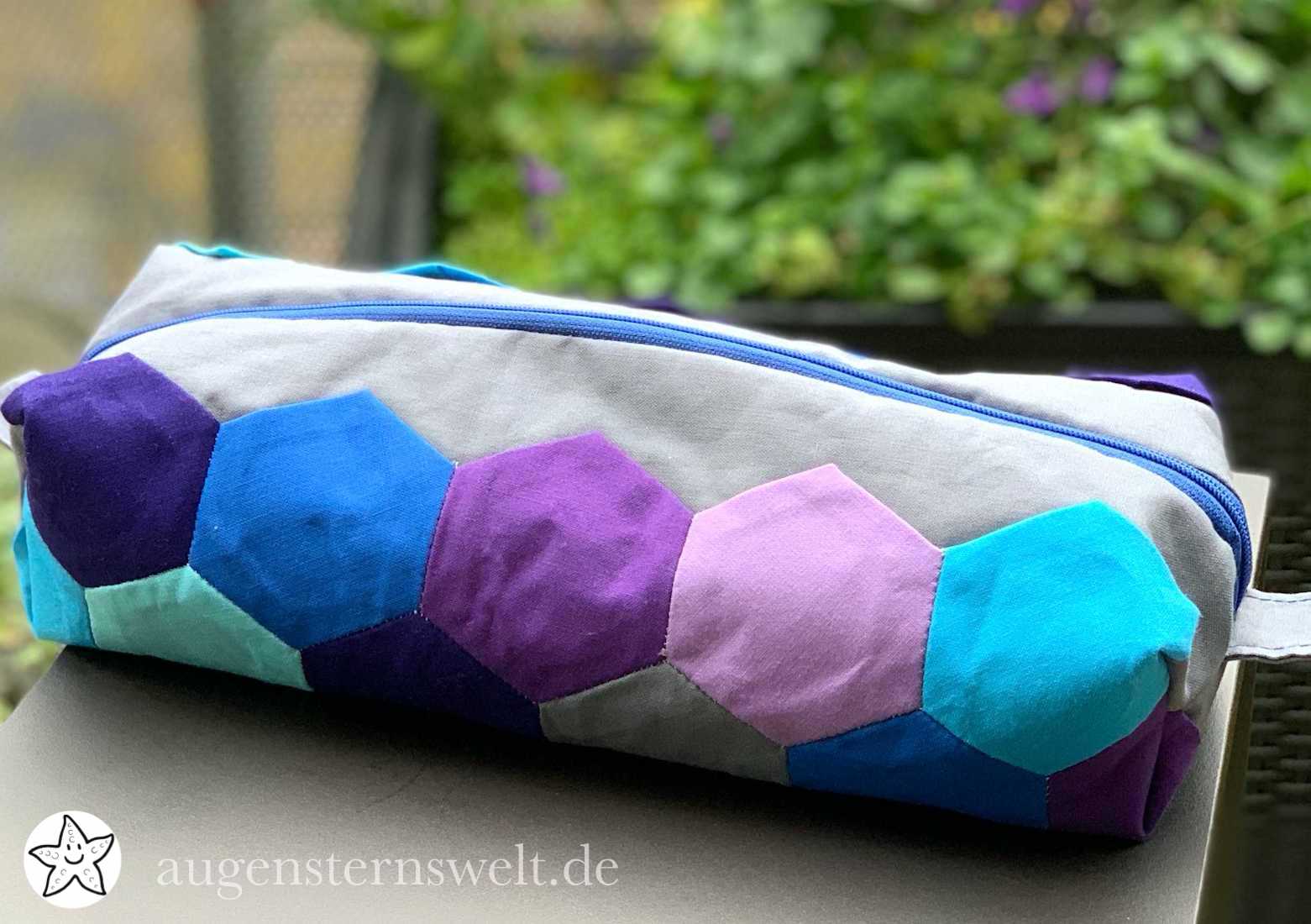 Letzte Woche zeigte ich auch einen kleinen Einblick, vielleicht erinnert Ihr Euch noch daran? Um die Hexies stärker zu fixieren, quiltete ich die Hexies mit verschiedenen Zierstichen fest. Die bunten Stoffe stammten aus einer Jelly Roll, die ich vor einer ganzen Ewigkeit kaufte. Ich finde das so praktisch, weil die Stoffe farblich und mit dem Muster alle zusammenpassen. Richtig gefreut hatte ich mich über die Nähanleitung des Freebooks. Alle Nähschritte sind wunderbar erklärt und leicht nachzuarbeiten. Da war auch der Reißverschluss fix eingenäht.
