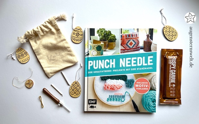 Noch weiter Gaben habe ich von Ulrike bekommen, ein Punch Needle Buch mit Werkzeug, Holz-Ostereier und Dänische Schokolade. Sie schrieb, dass die Grusskarte Nina aka wippsteerts gebastelt hat. Es sehr schönes Exemplar! Boah! Ich kann es noch gar nicht fassen. Die Geschenke sind allesamt großartig!!